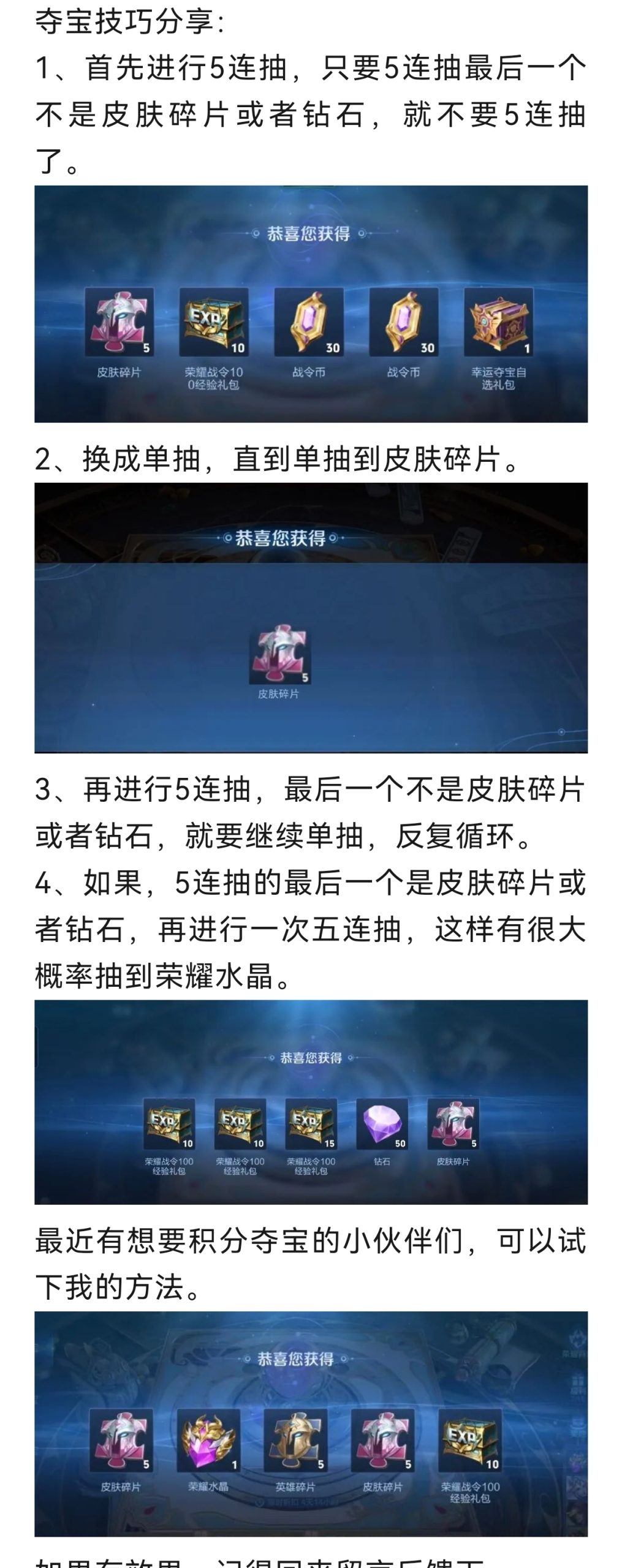 声明:游戏内抽荣耀水晶,并没有固定的方法,每次是否能抽到水晶,都是有游戏概率复杂计算得出。